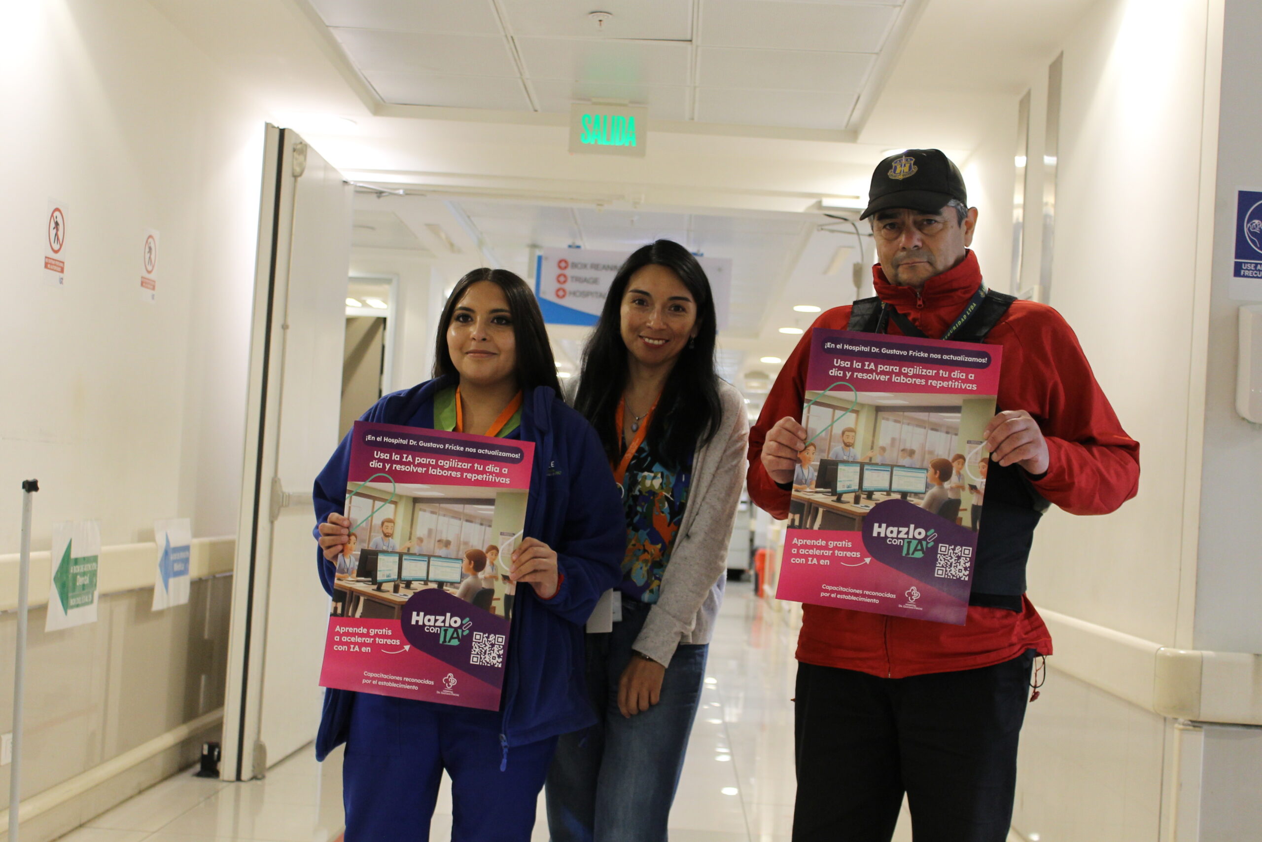 La jornada concluyó con un recorrido por las instalaciones, donde se desplegaron afiches informativos como parte de una campaña de difusión interna. Esta iniciativa busca motivar a todo el personal a realizar los cursos y obtener sus certificados, dando así el puntapié inicial a una colaboración que Hazlo con IA proyecta replicar en diversos servicios de salud a lo largo de todo el territorio nacional.